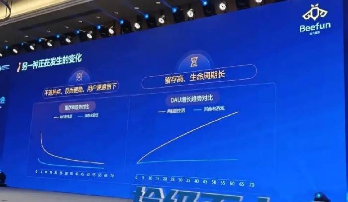 但我们同时也注意到,有些产品并非爆发式增长,而是曲线平缓、增长稳健。用户来得不算猛烈,却愿意留下来。比如我们旗下的两款游戏,橘色曲线是《向往的生活》,蓝色曲线是一款老游戏。从左侧留存数据能看到,《向往的生活》表现不错,这也直接带动了右侧DAU的稳步提升。