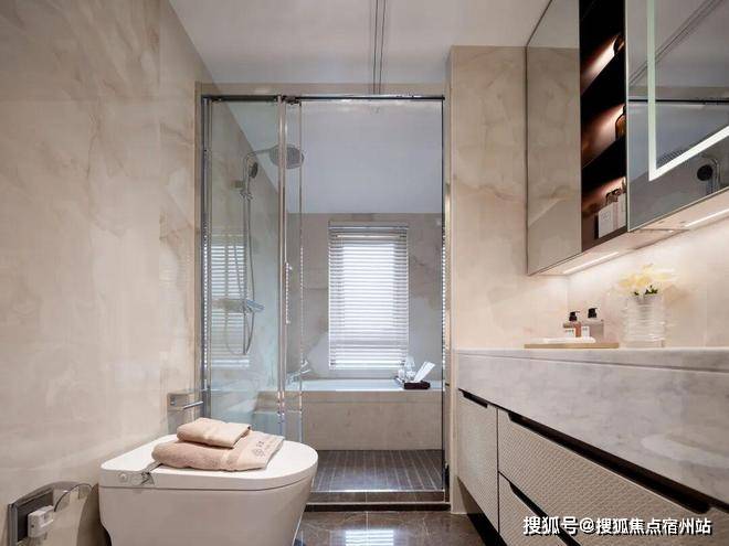 主卫的墙板选用仿玉石岩板,浴缸台则采用奥特曼米黄大理石包裹,而次卫则搭配了芬迪白岩板等材质,每一处细节都体现了对高品质生活的追求。