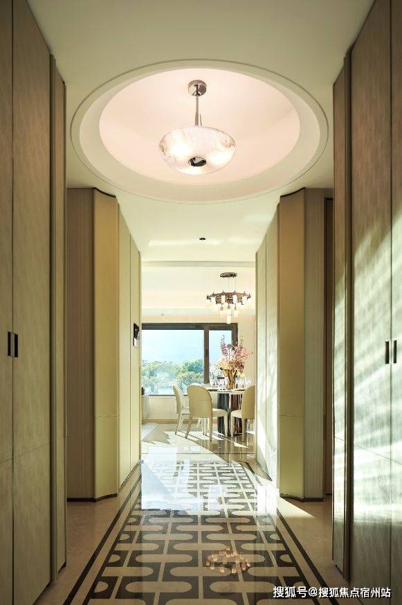 一梯一户与归家礼仪:通过错位设计实现实质的一梯一户,电梯厅成为私享空间。入户玄关采用奢石与水刀拼花工艺,营造出强烈的归家仪式感和尊贵体验。