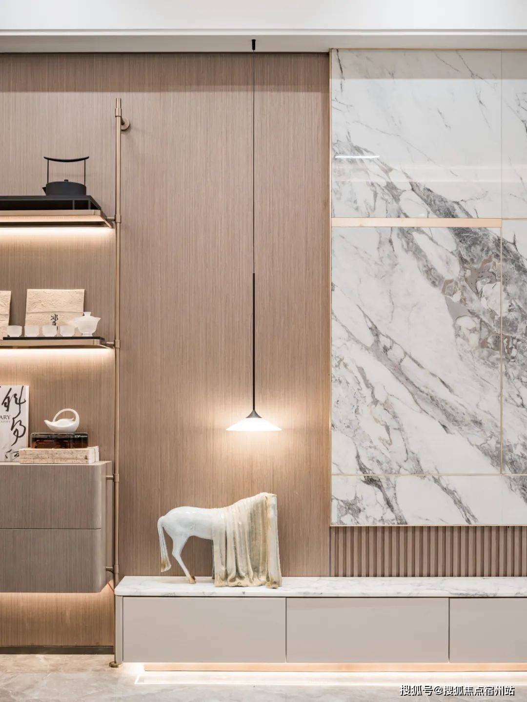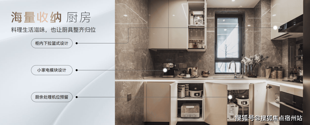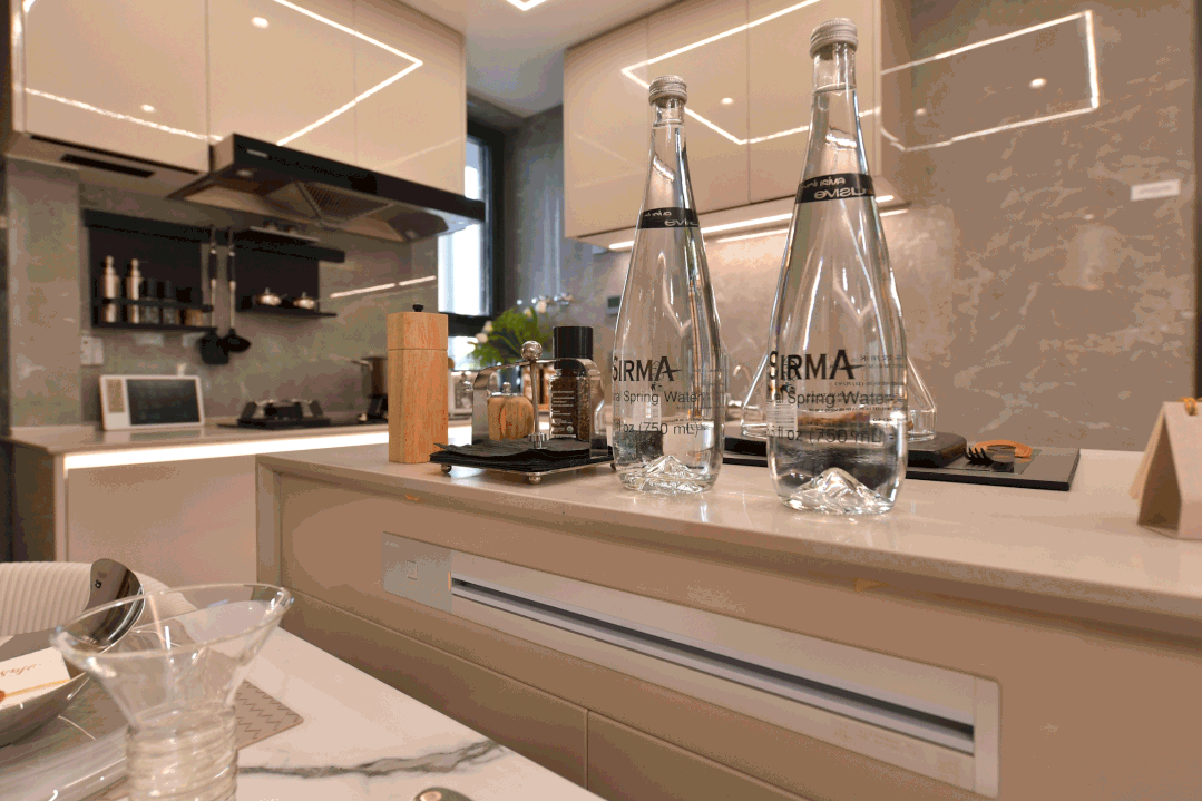 特别预置洗碗机点位、柜内下拉篮式设计、不锈钢挡油板、柜下操作灯、烹饪全流程功能动线一体化设计;样板间实景图丨仅供参考