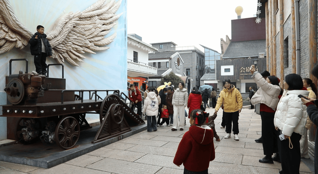游客 陈增金:我和哥哥、妈妈来到戏剧小镇游玩,看到了三个大玩偶和一个大雪人,和一辆花车,看到这些东西感到很开心,觉得这里很有趣。