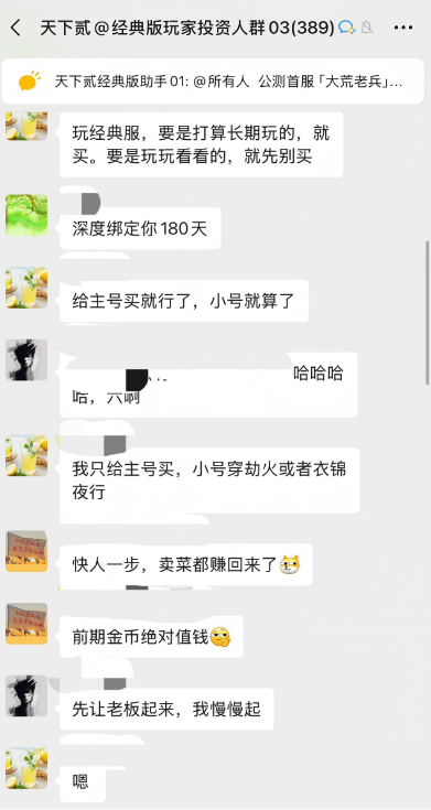 不过为什么搬砖党们会不约而同地选择在《天下贰经典版》搬砖呢?首先就是因为《天下贰经典版》中有很多经济实力倍儿硬的大佬。很多大佬在开服初期为了更快提升战力,对金币、各种材料的需求都很大,开服才过了一天,很多群里就已经有玩家开始收材料、卖金了。甚至有大佬在收金时直接放出了“有多少就收多少”的豪言,趁着需求大的时候入局卖金,必定是能卖出好价钱狠赚一笔的。