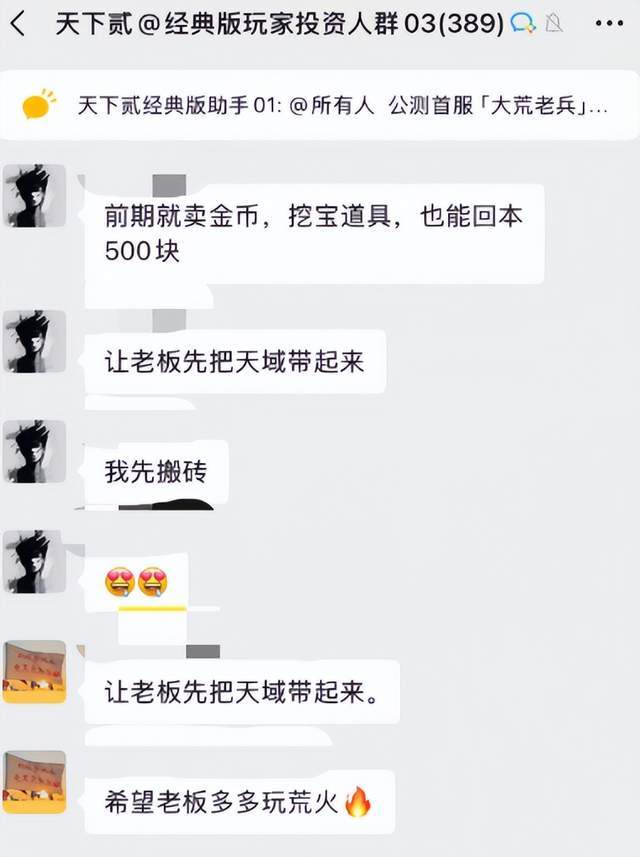 前来参与《天下贰:经典版》这次公测的有不少想要制霸大荒的大佬,可以说这回搬砖党们的春天是真的来了。毕竟大佬们想要制霸大荒,就得在装备上下功夫,而游戏中装备的合成和升级需要大量的五行盘、苏木等材料,不少大佬来不及刷材料就下血本购买。公测当天就有大佬在玩家群放话开始收金,并且有“有多少收多少”。此话一出,搬砖党们一夜之间光速就位,就为了在游戏里搬砖暴富!