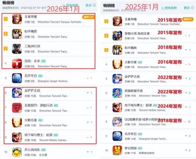 值得一提的是,腾讯已经不是第一次夺得「畅销榜TOP10独占8款」的傲人成绩。2025年开年之际,腾讯也取得了相似成绩。几乎都是同一时间,唯一的区别是今年座次大换血,长青游戏增加了2个席位。