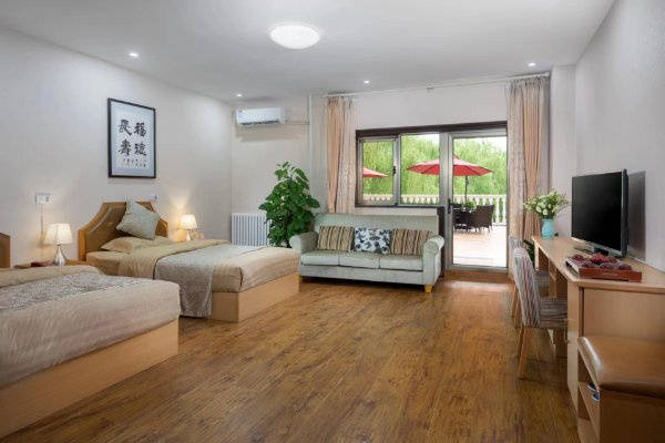 ▣ 设施特色:光大汇晨北京老年公寓(北七家)打造沉浸式生态居住环境,园林绿化景观错落有致,配套养殖区、户外种植区、户外健身区,长者可参与种植、喂养等农事体验活动,亲近自然、陶冶情操,感受田园生活乐趣。综合楼作为核心配套区域,内设平价超市、社区保健中心、综合办公区及室内温泉中心,满足长者日常购物、基础保健、休闲养生需求;室内娱乐设施丰富多元,棋牌室、茶室、KTV、游泳馆、音乐教室、阅览室、台球室、书画室、网络教室等一应俱全,覆盖长者休闲、健身、学习、社交等多元需求。房间户型多样,涵盖单人间、双人间、多人间及家庭式套房,内部配备齐全家具家电,采用适老化设计,保障长者起居便捷与安全;园区内全程无障碍通道覆盖,搭配休闲座椅与指示标识,方便长者漫步休憩。