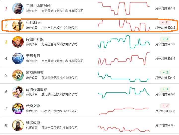 第三方数据显示,2026年1月的月度榜单,《生存33天》在微信小游戏畅销榜中位列第二,而在抖音小游戏畅销榜中位列第一。
