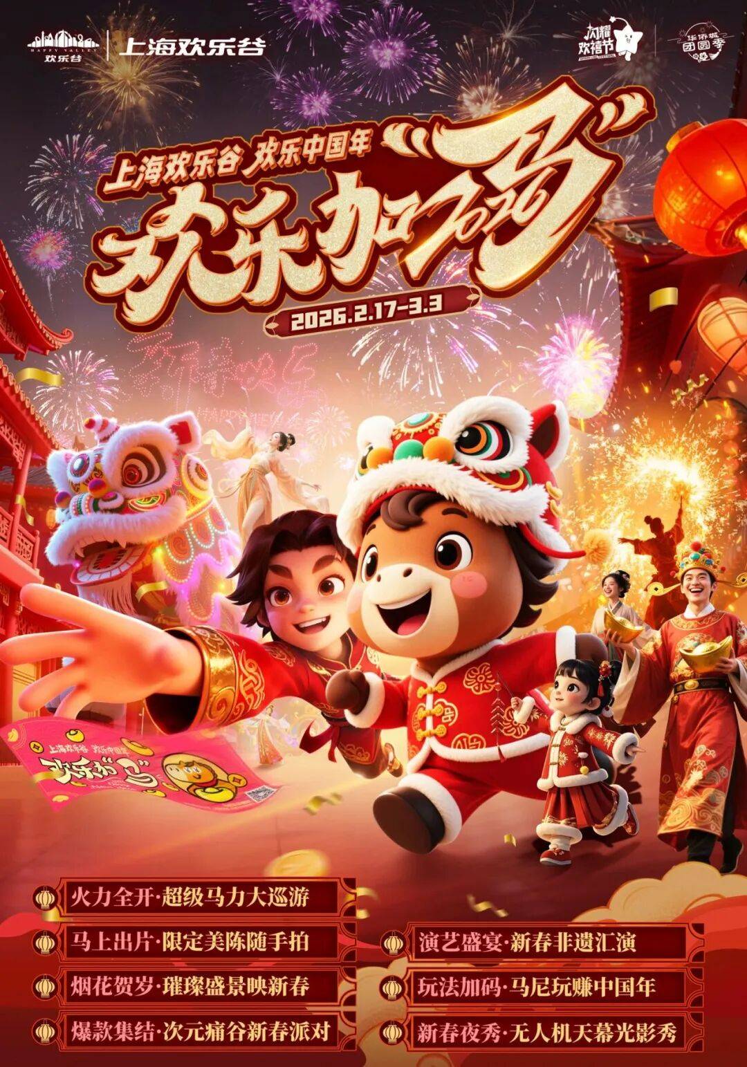 活动内容:本次“欢乐中国年”以“欢乐加‘马’”为主题,为您打造一场马不停蹄的狂欢盛宴。园区内处处可见生动的“马”元素装饰,更有全新升级的“次元痛谷”场景,让您仿佛闯入二次元的梦幻世界。白天有年味十足的主题演艺和限定巡游与您互动,夜晚则有非遗火壶表演压轴登场,燃烧的火焰在夜空中舞动,划出一道道绚烂流动的光弧,配合震撼的无人机烟花秀,照亮整个夜空,为您的新春留下璀璨记忆。此外,还设置了沉浸式新春互动游戏“马尼”玩法,游客可通过与NPC互动完成任务兑换好礼。