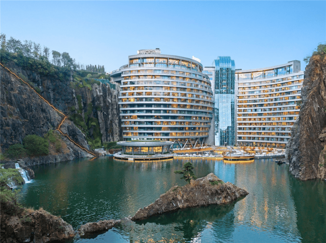 上海佘山世茂洲际酒店(深坑酒店)是全球海拔最低的五星级酒店,依托废弃矿坑打造海拔-88米的建筑奇观。336间客房均带观景露台,水下套房以水族馆视角直击海底世界。酒店融合矿坑瀑布、岩壁等自然元素,渔火水下餐厅、旋转玻璃栈道及3D水幕秀令人惊艳,攀岩、泳池等设施丰富体验。曾获詹天佑奖及“世界十大建筑奇迹”称号,毗邻欢乐谷与辰山植物园,是自然与奢华的震撼共生。