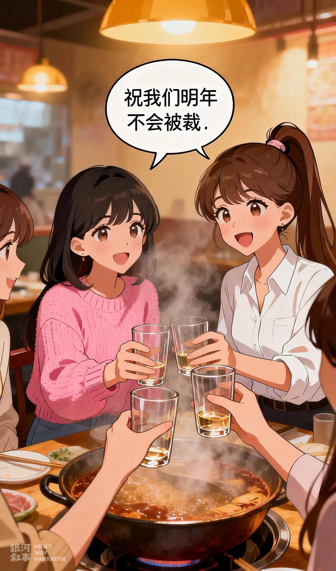 李茜茜今年依然穿上了漂亮的裙子,火锅店里,没有签名墙,也没有水晶灯,只有桌上翻滚的红汤和大家举杯说的那句“明年别裁我。”